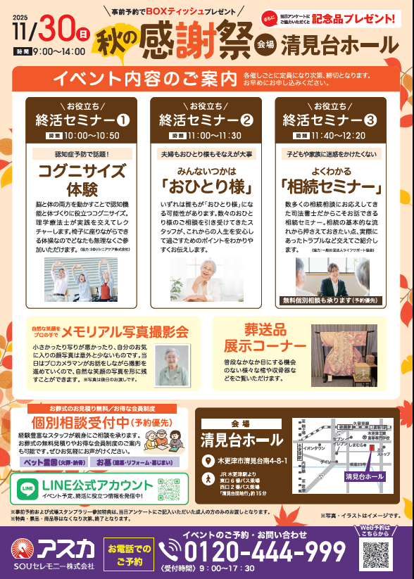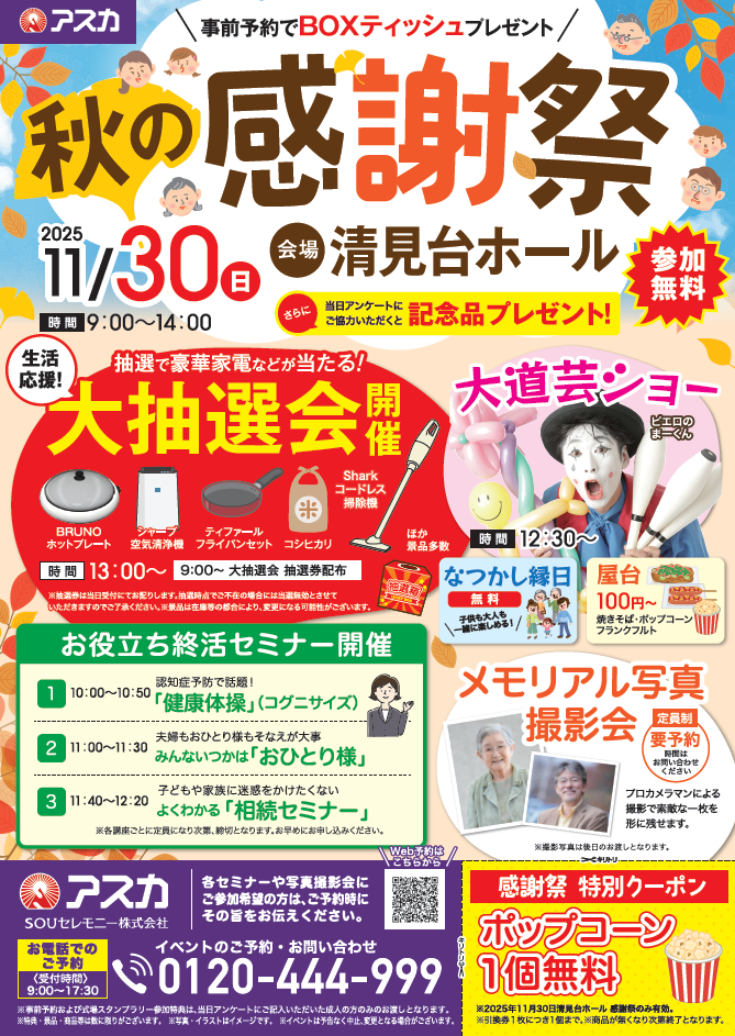 イベント 11/30(日)清見台ホール感謝祭!! 生活応援「大抽選会」/きれいに映せるメモリアル写真撮影/認知症予防にも♪楽しい健康体操/必ず役立つおひとり様終活セミナー・相続セミナー/楽しい大道芸ショーほか盛りだくさん