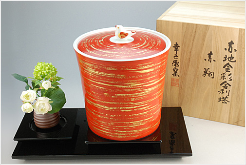 人間国宝 加藤卓男氏によって生み出された希少価値の高い数量限定の収骨器です。鮮やかな朱色と金彩の奏でる色彩が独自の美しさを醸し出しています。