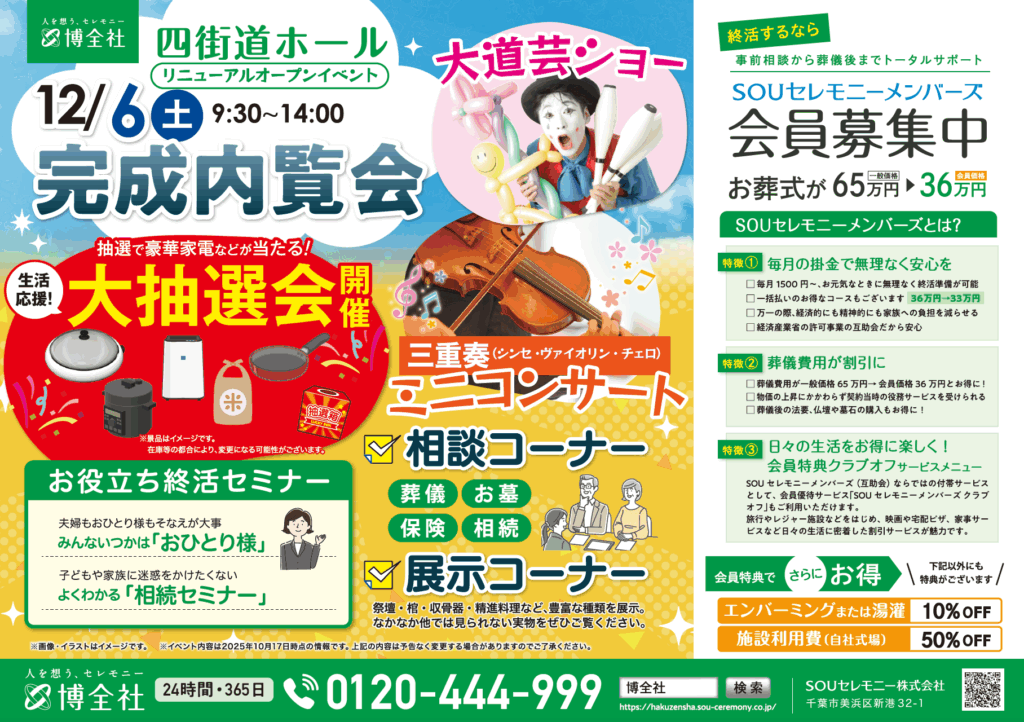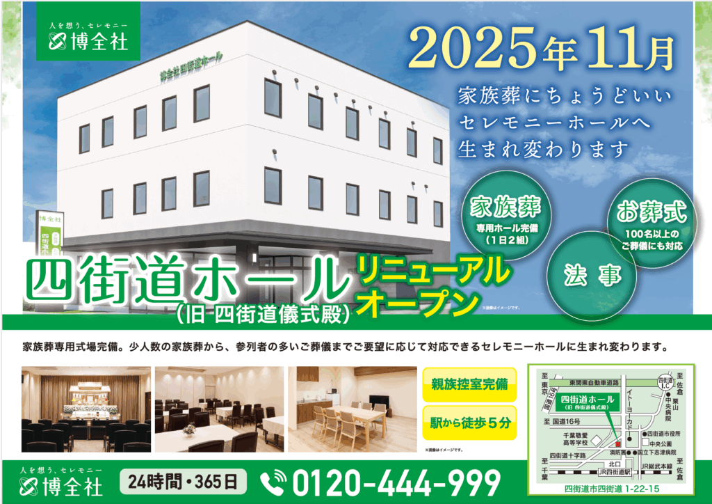 2025年11月上旬、博全社四街道儀式殿は家族葬のニーズに寄り添う「四街道ホール」としてリニューアルオープンすることとなりました。工事期間中におかれましては、会員さま及び地域の皆さまに大変ご不便をおかけいたしました。