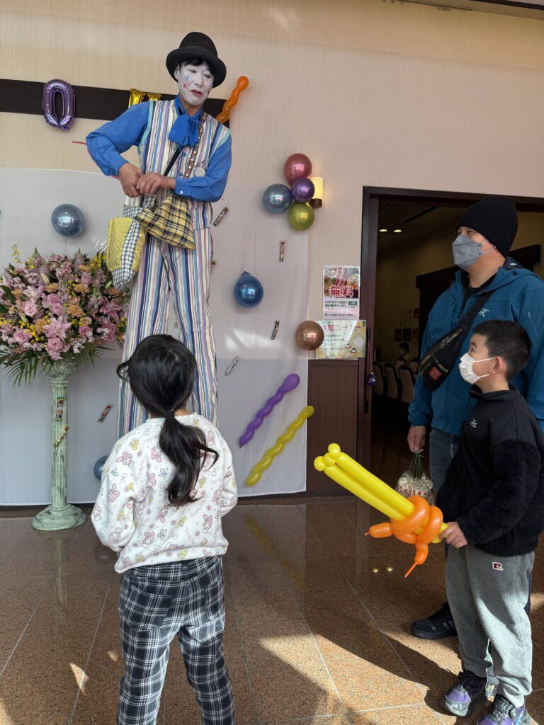 ピエロのまーくんは大道芸ショーはもちろん、館内をめぐるグリーティングも。その大きさに子供たちもびっくり!