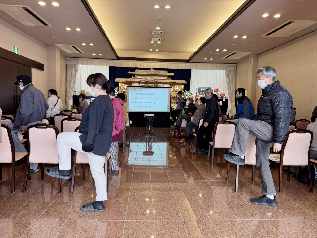 看護師・理学療法士による健康体操(コグニサイズ)は、役立つセミナーのほか、実際に椅子に座りながら手足を動かす体操を体験いただきました。