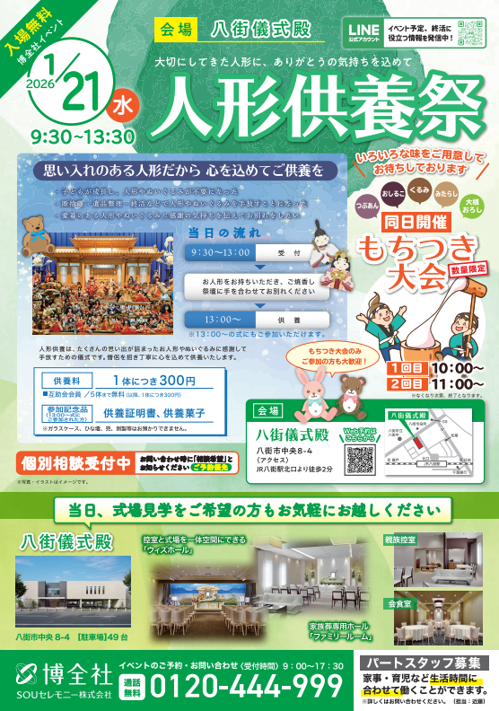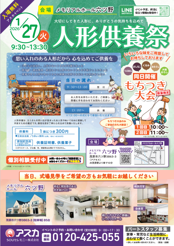 アスカ メモリアルホール六ツ野にて人形供養祭・もちつき大会を開催いたします。